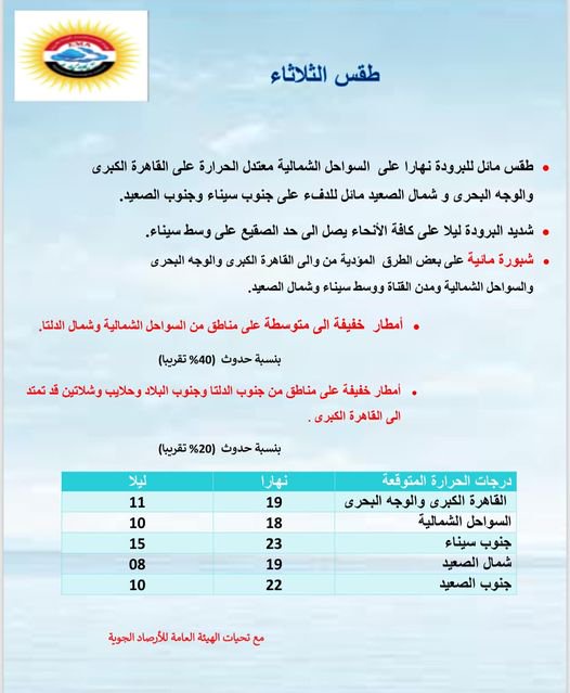 - سقوط أمطار خفيفة على مناطق من السواحل الشمالية وشمال الدلتا، بنسبة حدوث 40%.