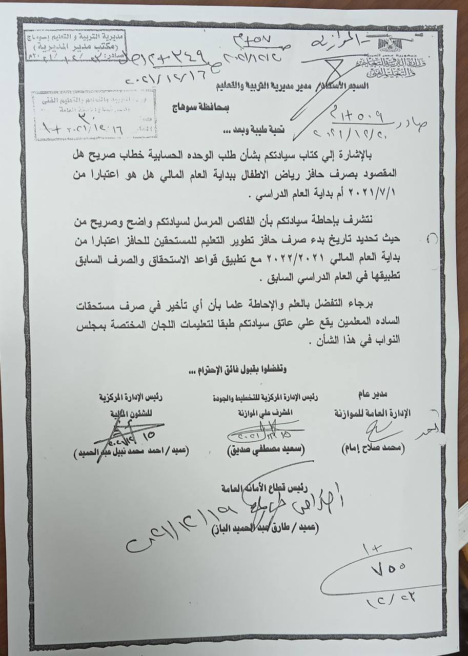 فاكس بالموعيد الجديدة لصرف حافز تطوير التعليم