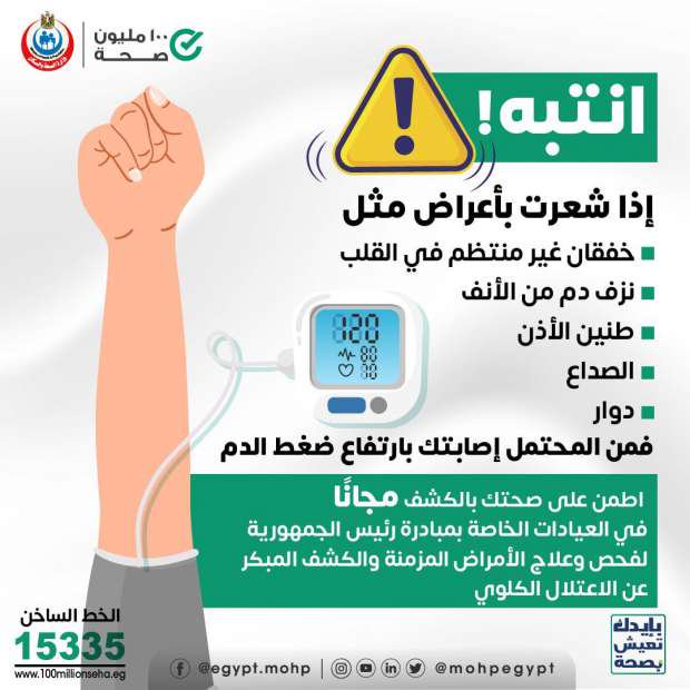 في إطار مبادرة رئيس الجمهورية، وجهت وزارة الصحة والسكان، عدة إرشادات طبية لتحذير المواطنين من احتمالية الإصابة بارتفاع ضغط الدم، وذلك لفحص وعلاج الأمراض المزمنة والكشف المبكر عن الاعتلال الكلوي.