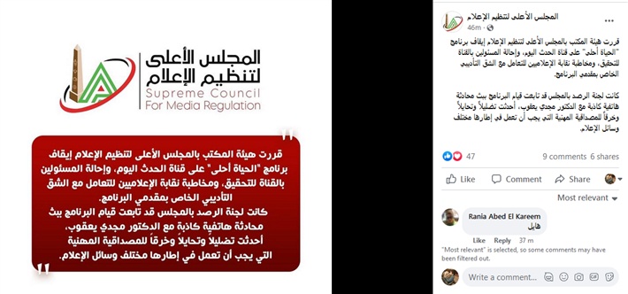 تابعت لجنة الرصد بالمجلس، قيام مقدمى برنامج "الحياة أحلى" شريف عادل ونوران محمود، ببث محادثة هاتفية كاذبة مع الدكتور مجدي يعقوب، أحدثت تضليلاً وتحايلاً وخرقاً للمصداقية المهنية التي يجب أن تعمل في إطارها مختلف وسائل الإعلام.