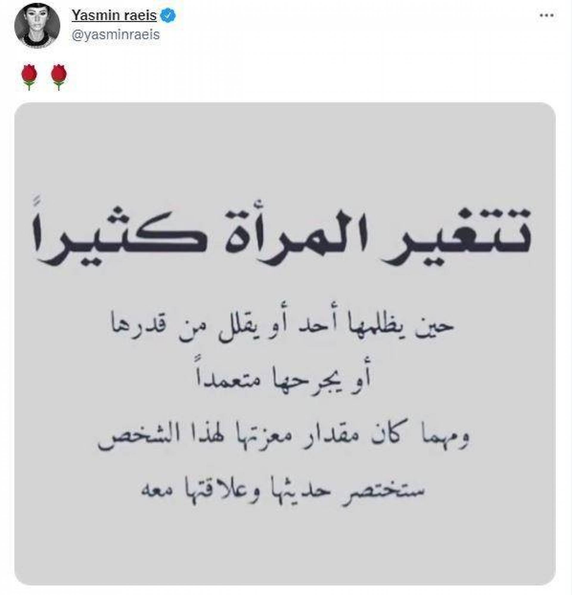 وكتبت "ياسمين"، في تغريدتها قائلة: "تتغير المرأة كثيراً حين يظلمها أحد، أو يقلل من قدرها، أو يجرحها متعمداً، ومهما كان مقدار معزتها لهذا الشخص ستختصر حديثها وعلاقتها معه".